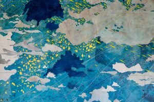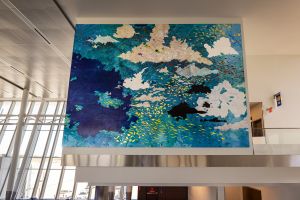 The work’s themes – interconnectedness, wonder, a sense of place – come to life through Britton’s palette of strong blues and gilded accents. She found a fabricator – Magnolia Editions in Oakland, California – to help bring the vision to life. Magnolia prepped 60, half-inch thick plywood panels with gold gesso.